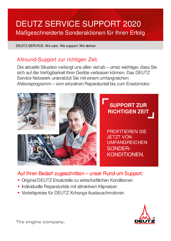 Die aktuelle Situation verlangt uns allen viel ab - umso wichtiger, dass Sie sich auf die Verfügbarkeit Ihrer Geräte verlassen können. Das DEUTZ Service Netzwerk unterstützt Sie dabei mit einem umfangreichen Aktionsprogramm vom einzelnen Reparaturteil bis zum Ersatzmotor.